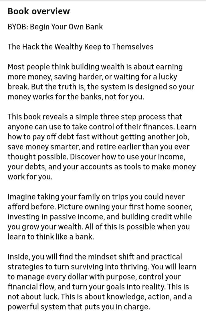 It teaches people how to depend on themselves and how to take control of their money by learning how banks really work and how to apply the same system personally. The goal is to help anyone understand how to manage, grow, and protect their money so interest, growth, and leverage work for them, not against them. BYOB is not just about money. It is about awareness, control, and freedom in every part of life.